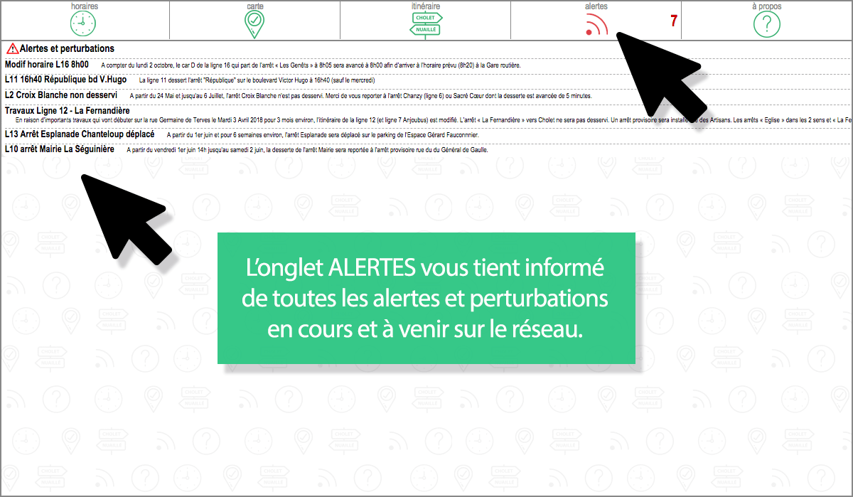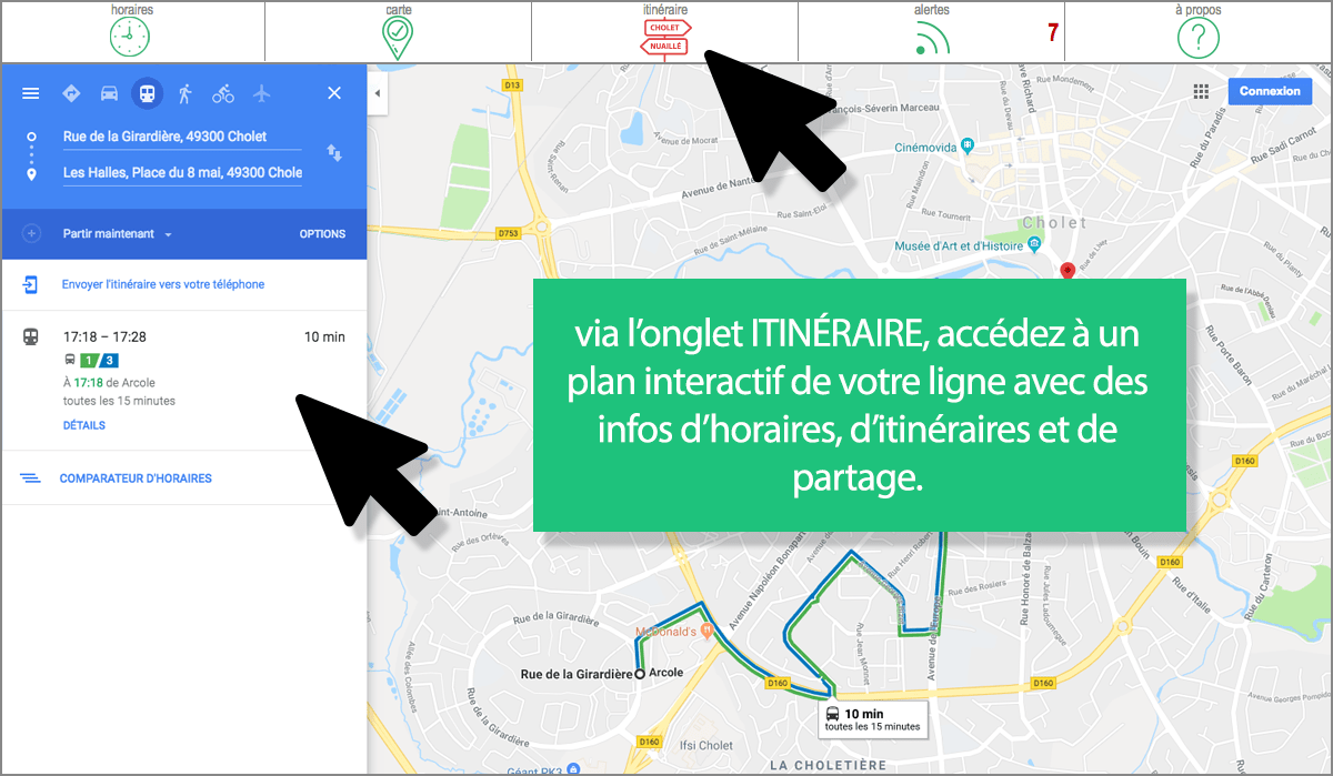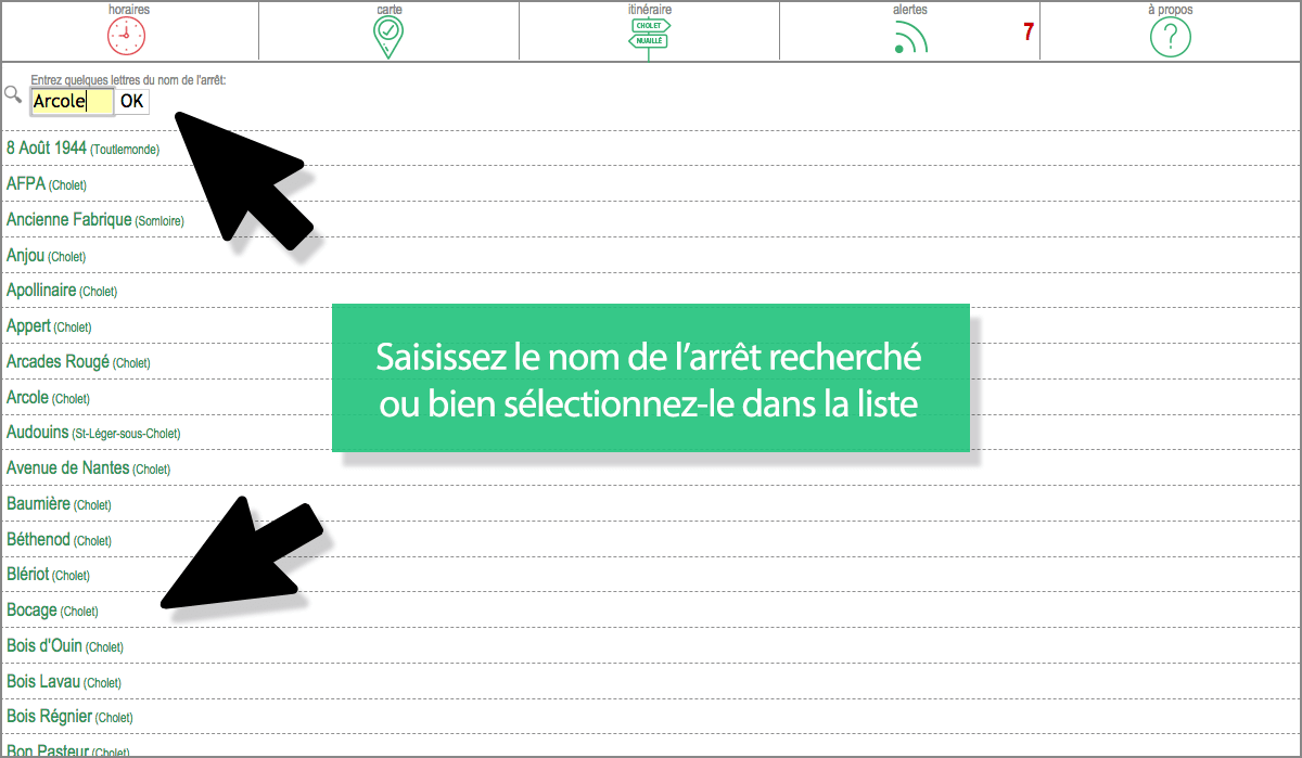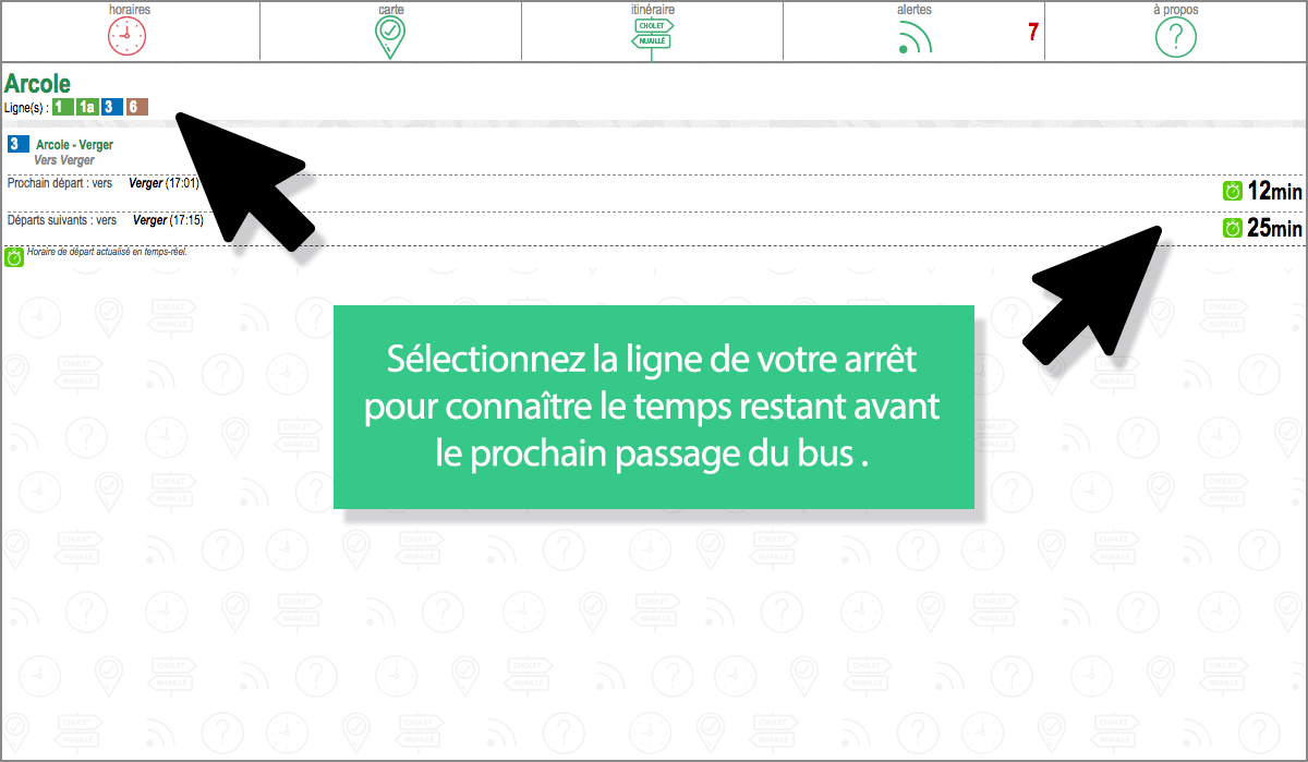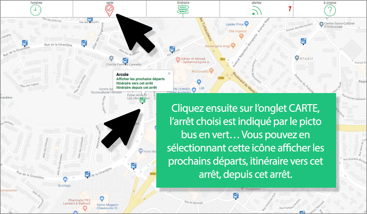 Il vous suffit de sélectionner un arrêt dans la rubrique HORAIRES  puis la ligne en question et vous pourrez consulter les horaires des prochains départs (mais aussi, si vous cliquez sur l’onglet CARTE , puis sur l’icône  calculer les itinéraires vers ou depuis cet arrêt). Suivez le tuto en images…